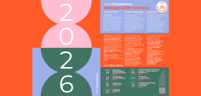 SwissFoundations réunira les acteurs du secteur des fondations aux niveaux régional et national, notamment à l’occasion du Forum des fondations, du 25e Symposium des fondations, ainsi que dans le cadre des cercles de travail et des tables rondes. Nous développerons et consoliderons également des offres destinées aux membres des conseils de fondation et aux directions, notamment à travers le Presidential Exchange, le Roundtable Foundation Board et le Roundtable CEO Mastermind.