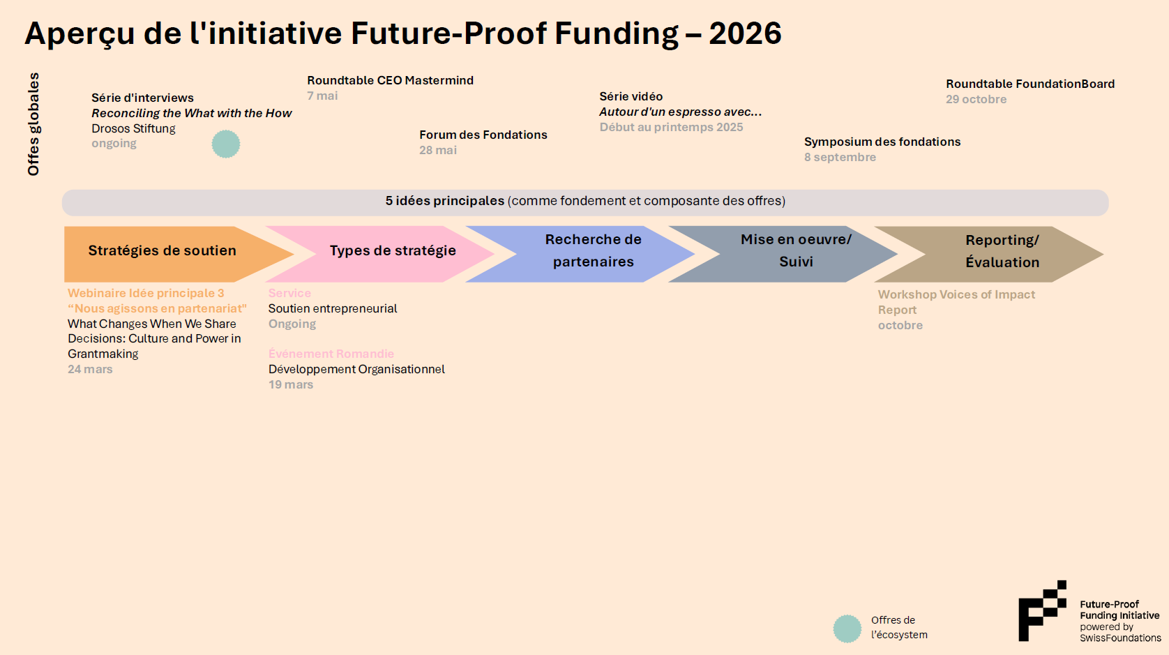 Dès sa première année pilote, l’initiative a démarré par une enquête auprès des membres de SwissFoundations afin de répondre au mieux aux besoins des fondations donatrices. Plus de 100 personnes y ont participé. Sur cette base, et en concertation avec le groupe d’accompagnement, les premières offres ont été élaborées. Celles-ci comprenaient des formats déjà existants, de nouveaux formats ainsi que des offres issues de l’écosystème de SwissFoundations, c’est-à-dire proposées par des membres ou des partenaires. Lors de cette première année pilote, l’accent a été mis sur l’idée principale 1 « Nous regardons vers l’avenir ».