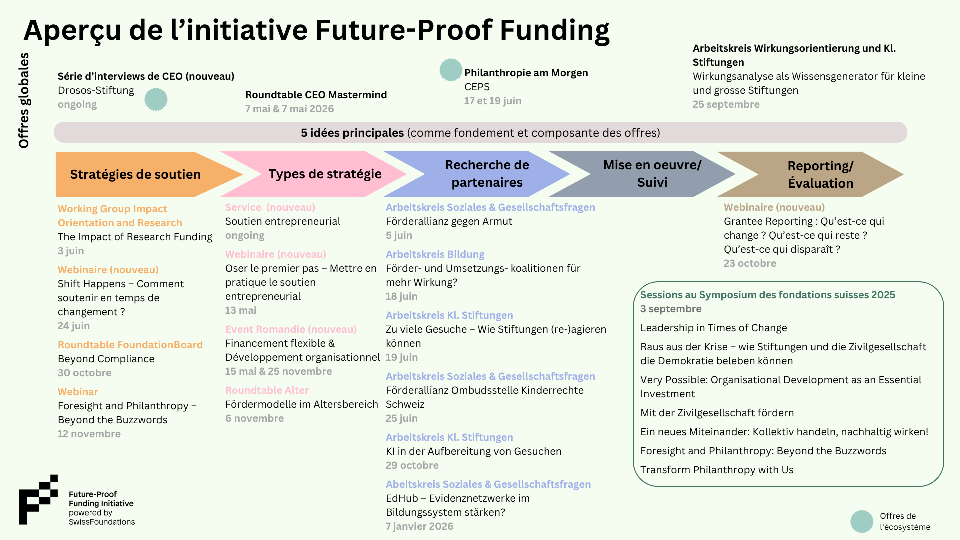 Pour répondre au plus près des besoins des fondations donatrices, l’initiative a débuté par une vaste enquête menée auprès des membres de SwissFoundations, à laquelle plus de 100 personnes ont participé. Sur la base des résultats, et en collaboration avec un groupe de travail, les premières offres ont été conçues. Elles combinent des formats existants, des nouveautés, ainsi que des contributions issues de l’écosystème SwissFoundations, qu’elles proviennent de ses membres ou de ses partenaires. L’ensemble de ces offres suit une démarche agile : expérimenter, apprendre, adapter et avancer. L’initiative se développe ainsi de manière continue, nourrie par l’engagement, les retours et les idées de ses membres.