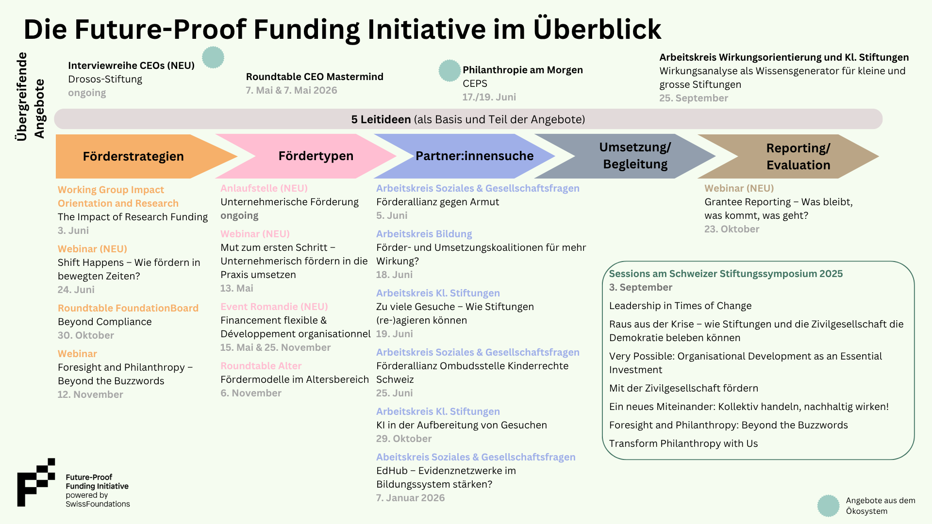 Die Welt ist im Wandel – auch für Stiftungen. Viele stellen sich die Frage, wie sie auch in Zukunft grösstmögliche Wirkung erzielen können. Deshalb hat SwissFoundations für seine Mitglieder die «Future-Proof Funding Initiative» ins Leben gerufen. Der Leitgedanke: Durch Austausch und Einblicke in aktuelle Entwicklungen rund ums Thema Förderung gewinnen wir Orientierung, Wissen und Impulse.